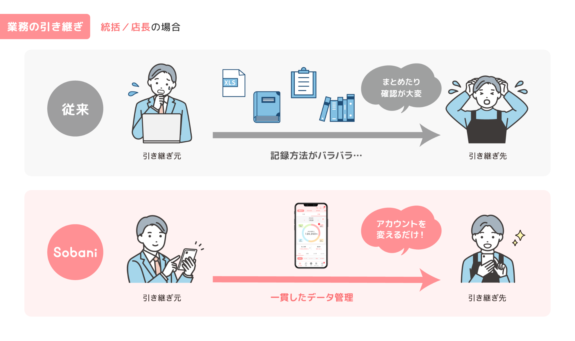 しかし、Sobaniを使えば、記録方法が統一されており、過去を遡ることも簡単に行えるため、データを引き継ぐ際に受け手が混乱することもありません。